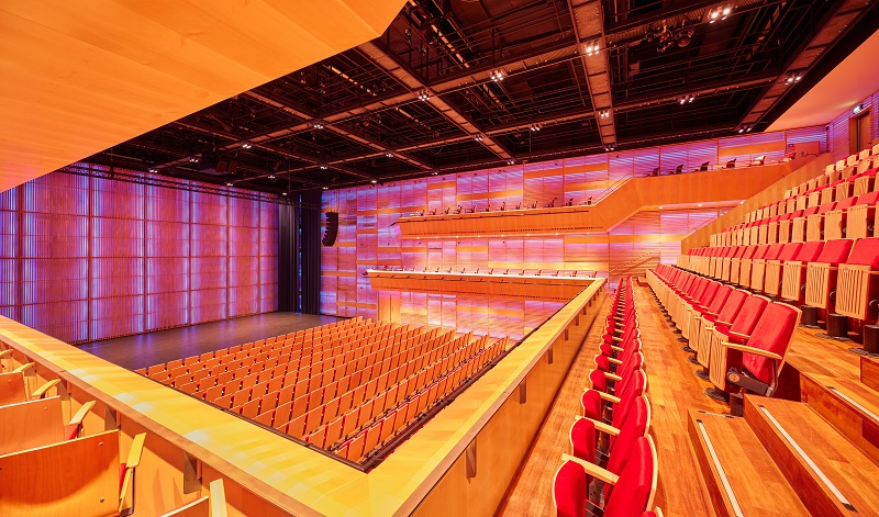 De Moodspot WRGB kenmerkt zich door de hoge CRI en R9 waardes. Uniek is dat deze spot flickerfree zowel van, als naar 0 dimt en daarbij volledig de “blackbody” aanhoudt. Dwz, dat tijdens het dimmen de kleurtemperatuur steeds dezelfde curve volgt als natuurlijke lichtbronnen, zoals gloeilampen. Via DMX zijn verschillende modes, zoals warm dimming, tunable white en RGBW individueel per spot op afstand te regelen. Voor de aansturing is gebruik gemaakt van TDE IZI-Link via de bestaande 2-aderige bekabeling, waardoor er aanzienlijke besparing mogelijk was op materiaal- en installatiekosten. Op verzoek van de technici van het Muziekgebouw werden ook Snoots toegepast, onder andere om het licht af te schermen van de wanden, die apart met ledstrips aangelicht worden.